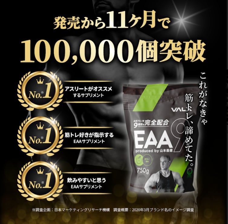 『VALX EAA9』は、山本義徳氏監修のもと、必須アミノ酸9種類とβアラニンをトレーニングに最適な量・比率で配合したトレーニーのためのEAAサプリメント。圧倒的な実感力であなたのトレーニングをサポートします。