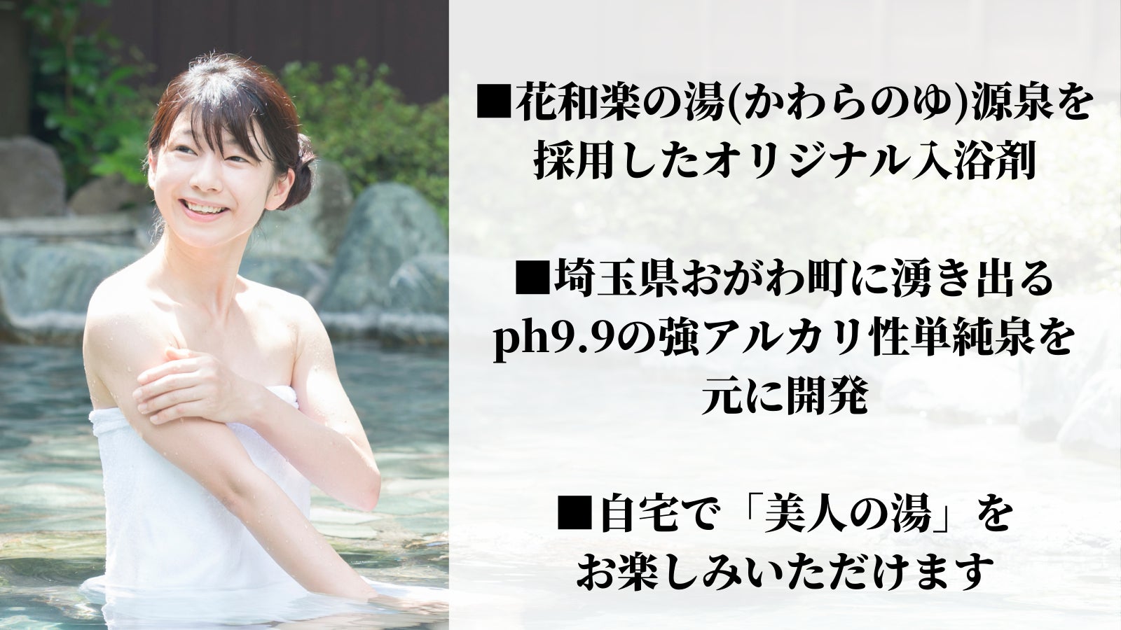 おがわ温泉 花和楽の湯(埼玉県 小川町)は、お得に長期滞在できるよう新プランを用意いたしました。また、花和楽の湯「美人の湯の源泉」を採用したオリジナル入浴剤の先行予約販売を応援購入サイトMakuakeにて開始しました。