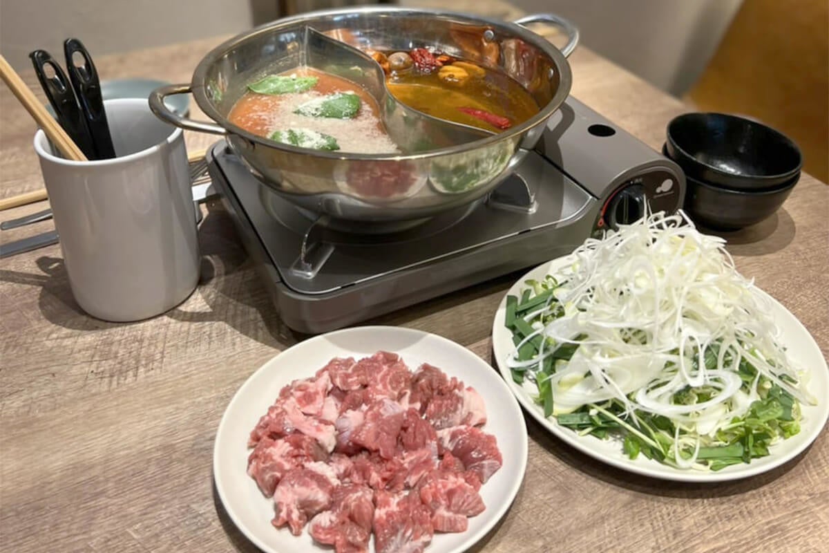 ラムアンドピース、おすすめメニューの「ラム肉のしゃぶしゃぶ」、ラム肉と最高に合うスープ出汁を4種類ご用意いたしました。オーダーは、お二人様からお受付しており、〆もついてきます。