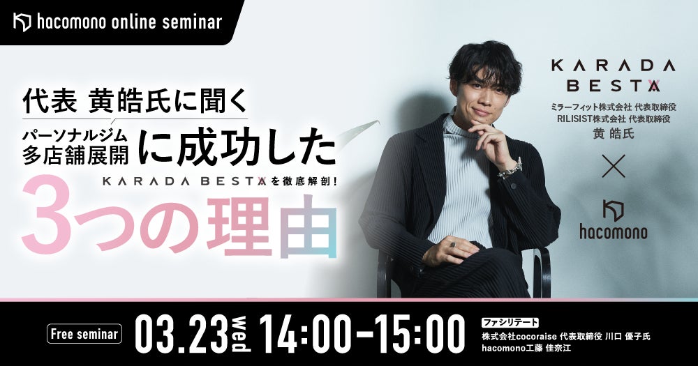 月謝制サブスク店舗のための次世代 会員管理・予約・決済システム「hacomono」(https://www.hacomono.jp)は、2022年3月23日(水)にKARADA BESTA 代表 黄皓氏に登壇いただき、無料セミナー「パーソナルジム多店舗展開に成功した3つの理由」をオンライン開催いたします。