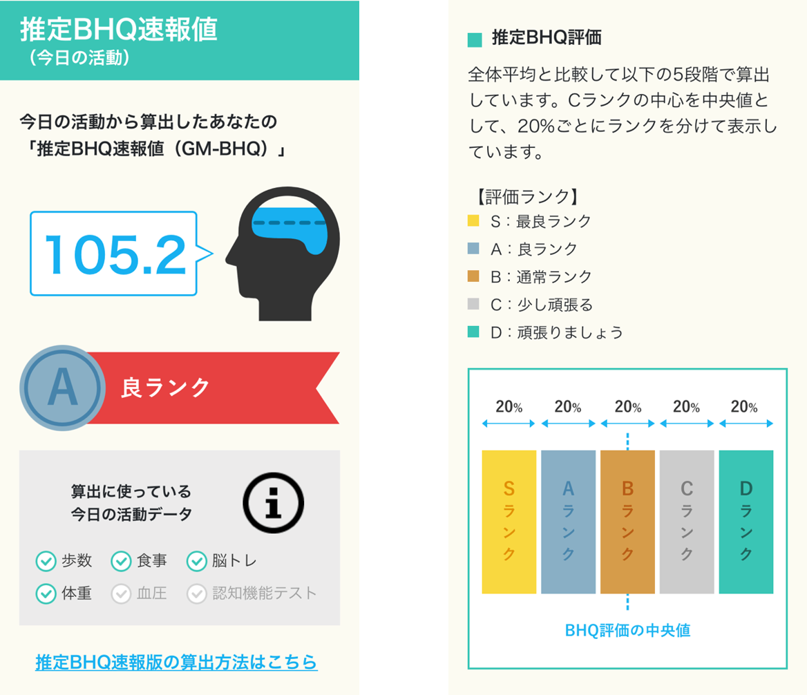 本機能は、アプリ内に日々記録される、アプリユーザー個人の歩行数や食事内容・脳トレーニング結果といったデータをもとに、S~Dの5段階で推定BHQを測定できる機能です。