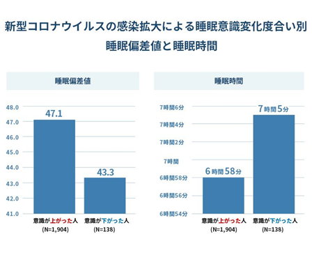 睡眠意識が上がった人は、下がった人よりも睡眠時間が7分短かったのですが、睡眠偏差値は上がった人のほうが3.8ポイント高くなりました。睡眠意識が上がった人は、寝室の環境の改善や睡眠に悪影響を与える行動を見直