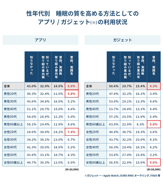 睡眠アプリの使用が若い世代、ガジェットがむしろ高齢者というのは興味深い傾向ですが、それらの存在を知らない人も半数近く存在します。