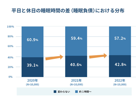 のが、今年の調査では+1時間9分と、5分短くなりました。このことから平日に溜まった睡眠負債を休日に寝だめすることで解消しようとする傾向が減っており、日本の睡眠負債が減少していると言えます。