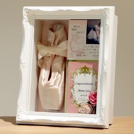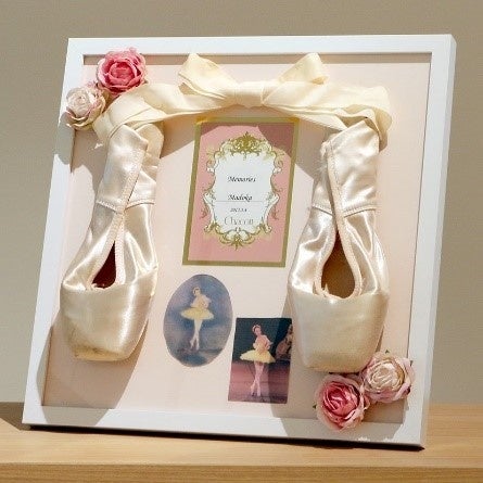 はじめて履いたトゥシューズや記念のトゥシューズを、写真やチケットなどと共に1枚のフレームにデザインします。見るたびに舞台での思い出が蘇ってくるでしょう。ご自身の記念にも、贈り物にも最適です。