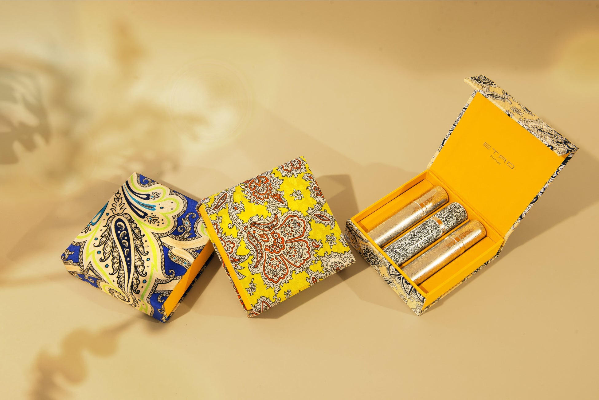 ペイズリー柄を用いたエトロパース・スプレートリオは、お気に入りの香りをいつも持ち歩くことができ、そのとてもラグジュアリーなパッケージはエレガンスと洗練さが際立ちます。美しさ、エレガンス、洗練さが宿ったセットは、エキゾチックでノマディックなメゾンのスピリットを体現しています。