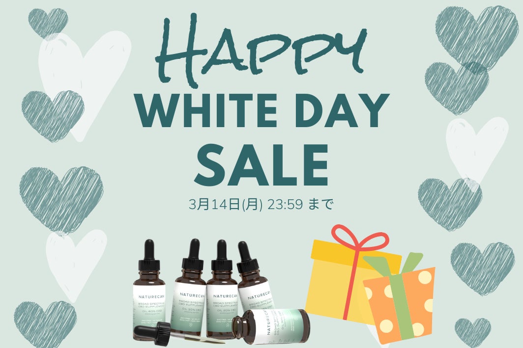 来るホワイトデーに合わせ、Naturecan公式サイト(https://www.naturecan.jp/)では、White Day セールを開催中です。続々登場中の新製品はもちろん、看板商品のCBDオイルも最大62%オフでご提供しております。おいしいCBD製品は、どれもホワイトデーのお返しにぴったりです。