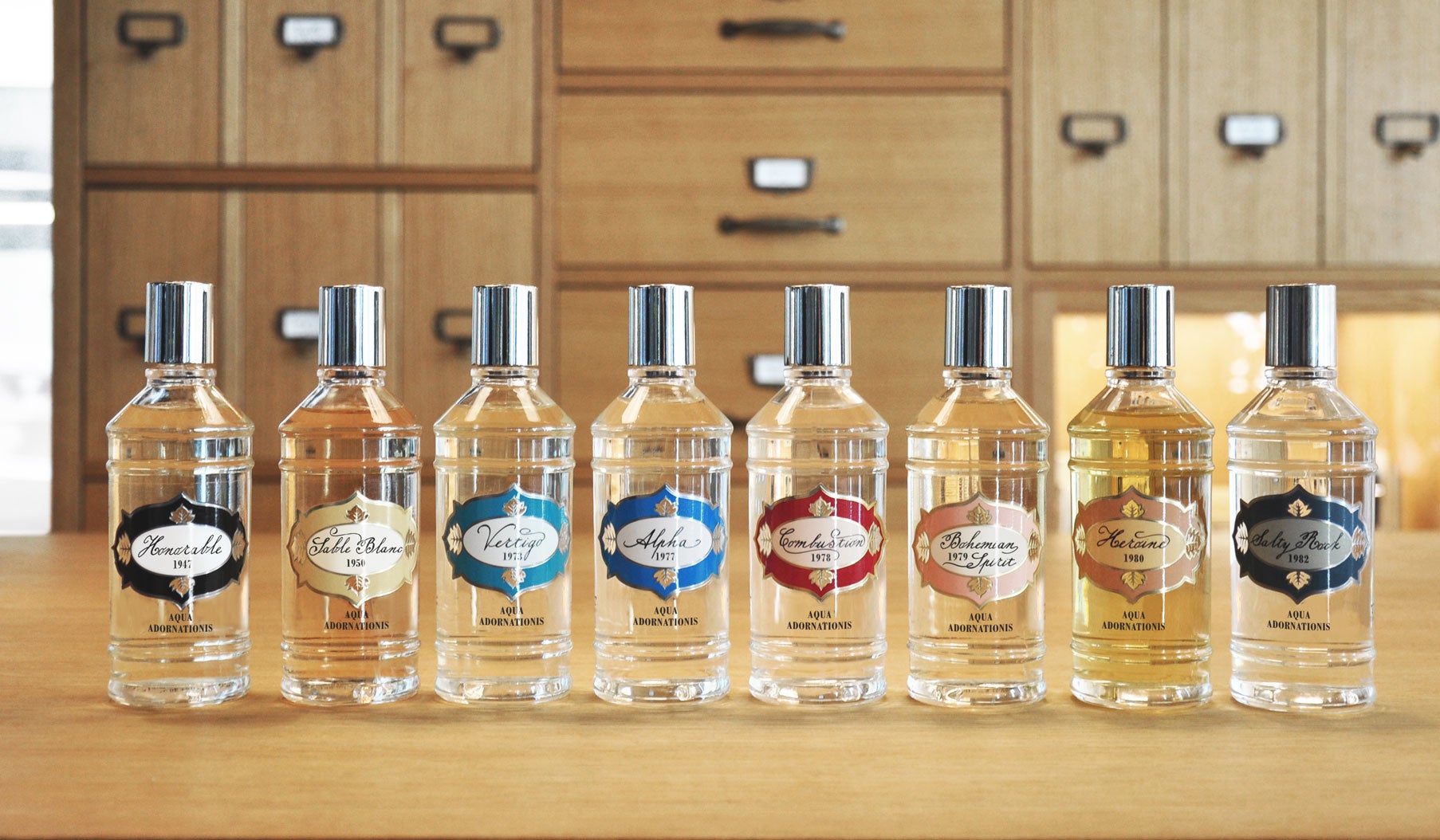 こちらは、LabSolueを生み出したマートン家の姉妹、ジョルジア・マートンが作った貴重な香り「1947 Honorable」から始まりました。一族の経営する化粧品会社「Marvin」の歴史的で魅惑的なデザインを復元し、過去の伝統的なイメージど、自らの深い愛を融合されて作られています。1947、1950、1973、1977、1978、1979、1980、1982のそれぞれの年に想いを寄せた展開。
