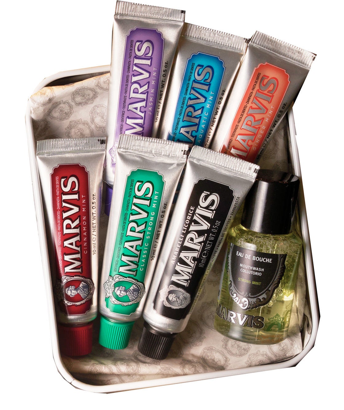 MARVIS6種のフレーバーの歯磨き粉と、マウスウォッシュがセットになった、ミニキット。トラベルサイズのアイテムは、フレーバーを試したりお持ち歩きに最適です。アーティストとコラボレーションしたMARVISのプレミアムなアートデザインがプリントされたティンボックスは、コレクションしたり、ギフトにも!