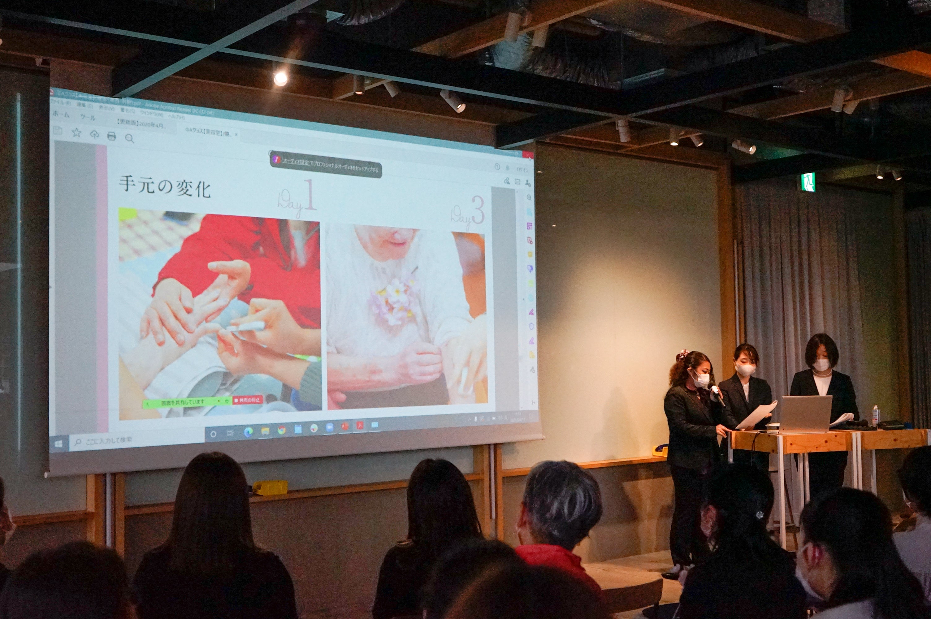 ケアビューティーコースの1年制(ケアビューティーマイスター専攻)を修了した受講生が、アセスメントプロジェクト(現場実習)を通じて得た介護美容の身体的・精神的な効果などを、プロジェクトの集大成として発表致します。過去に行った事例研究では、認知症や身体的な理由で美容・整容動作が困難になっていた方へ美容を施すことにより不穏行動の減少や身だしなみの改善などが見られたという事が発表され、今後、更に高齢化していく日本の中で、介護美容が重要なファクターになるという可能性が示されました。