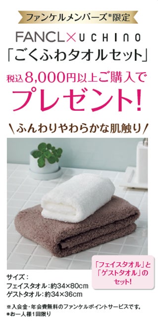 ファンケルショップメンバーズに加入されている方が、税込8,000円以上ご購入されると、ファンケル×UCHINOオリジナル「ごくふわタオルセット」をプレゼント
