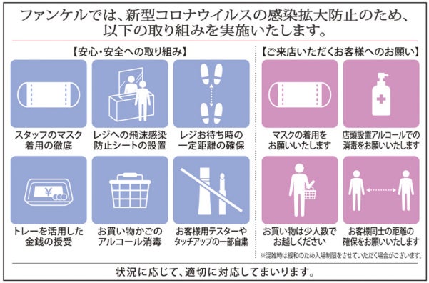 ※ファンケルではお客様の健康と安全を配慮し、現在新型コロナウイルス感染防止対策として、お客様のお肌に触れる接客およびスタッフからの積極的なご案内を自粛しています。