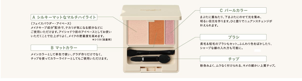 多機能に使用できるマルチユースなアイパレットは、想いのままに塗布するだけで、顔印象を華やかに楽しい表情へ。