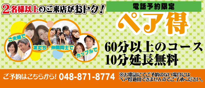 ペア得キャンペーンはお友達様、ご家族様どなたでも2名以上でとてもお得にマッサージが体感できます。延長15分820円のところ今回に限り延長料金が無料!!
