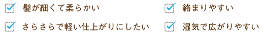 髪が細くて柔らかい絡まりやすいさらさらで軽い仕上がりにしたい湿気で広がりやすい