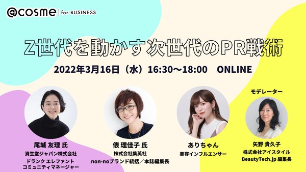 登壇者として、美容・ファッション誌を代表してnon-no編集長の俵 理佳子氏、化粧品ブランドを代表してドランク エレファントの尾城 友理氏、インフルエンサーを代表してありちゃんにご参加いただき、それぞれの視点からZ世代との向き合い方やとらえ方をお話いただきます。