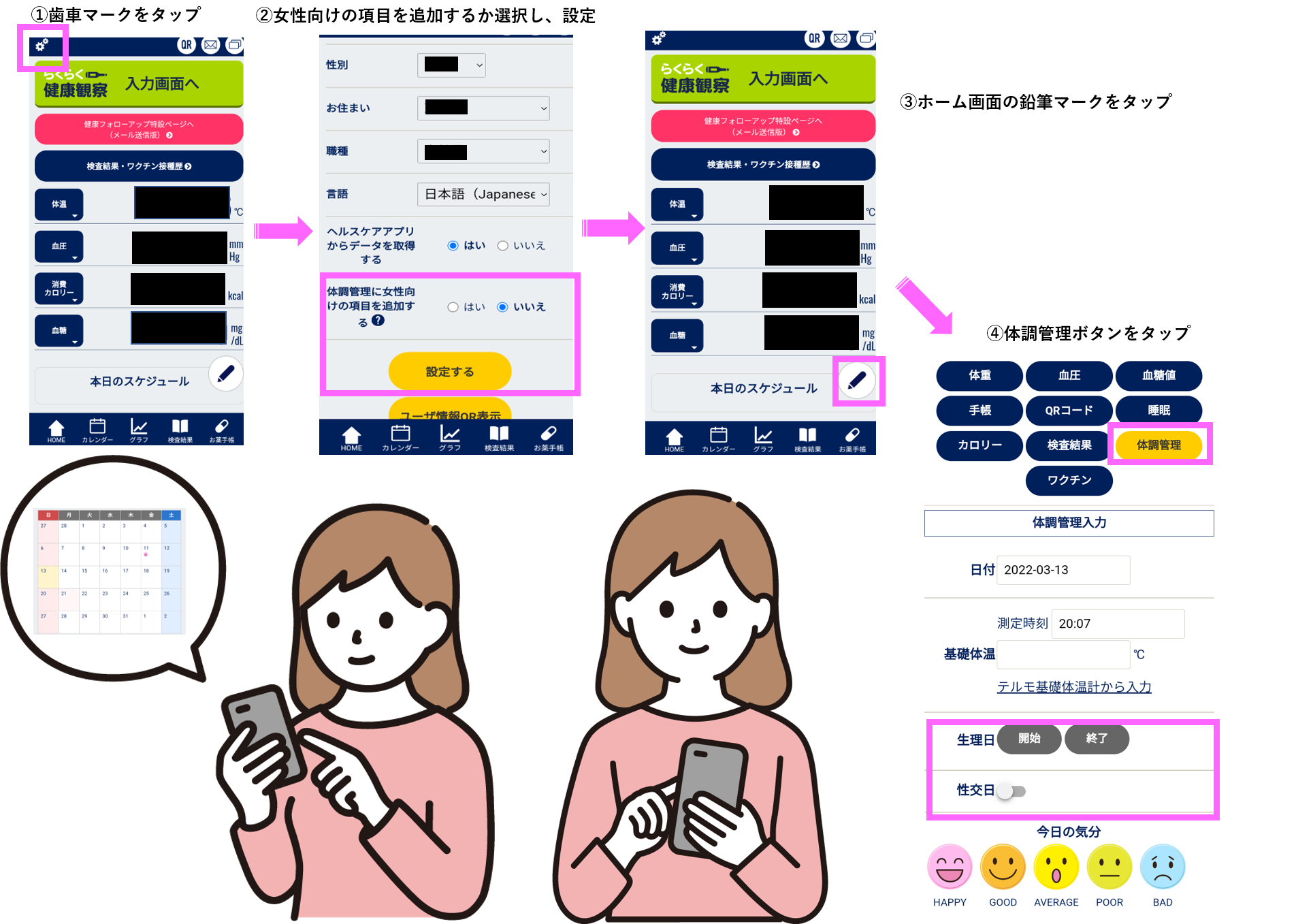 また、女性向けの項目として生理日などを追加。女性の生理周期の把握や妊活をサポートします。