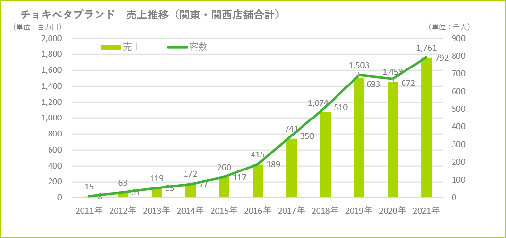 チョキペタは2011年7月に第一号店をオープンし、昨年ブランド10周年を迎えました。首都圏と一部関西に出店を進め、オープンから順調に店舗数を増やし現在65店舗(2022年2月末日時点)を展開しています。順調に店舗展開を進める中で2020年4月に第一回目の緊急事態宣言が発令され、大多数の店舗で約1か月間休業するなど新型コロナウイルス感染拡大の影響を大きく受けました。しかし、環境衛生業としての側面も持つ美容サービスはコロナ禍でも日常生活においてなくてはならないものとして一定の需要があり、中でもチョキペタは、コロナ禍以前から高まりを見せていた「ヘアメンテナンス」への需要を取り戻し回復に向かい、2021年は過去最高の年間売上となりました。現在は、感染対策を徹底した店舗運営で安心してご来店いただける環境作りに取り組み、オープン当初と比較すると117倍の売上に成長しています。