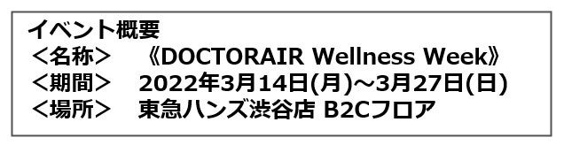 今回、『ドクターエア』では、ヘルシーライフを実現するボディケアグッズ体験会《DOCTORAIR Wellness Week》を東急ハンズ渋谷店・B2Cフロアにて開催いたします!