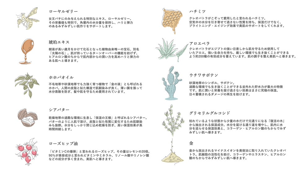 Cleo’s Beautéではコンセプト成分として、クレオパトラが愛した植物成分や過酷な環境で育った生命力の強い10の成分を厳選し「Cleo’s ESSENTIALS」として商品に配合しています。