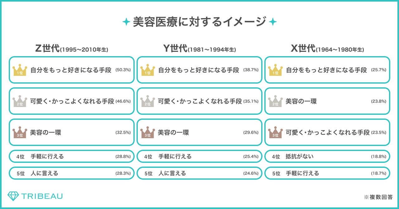 美容医療の⼝コミ・予約アプリ「トリビュー」を運営する株式会社トリビュー(本社:東京都渋⾕区、代表取締役:⽑迪)は、Z世代(16-27歳)、Y世代(28-41歳)、X世代(42-59歳)の男女49,499人を対象に「美容医療に対する意識調査」を実施いたしました。