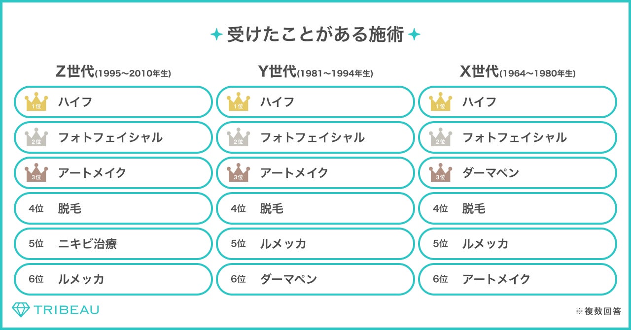 経験施術を聞いたところ、全世代「ハイフ」が1番多く、次いで「フォトフェイシャル」となった。順位は多少異なるが、どの世代も肌管理系の施術が多い結果となった。