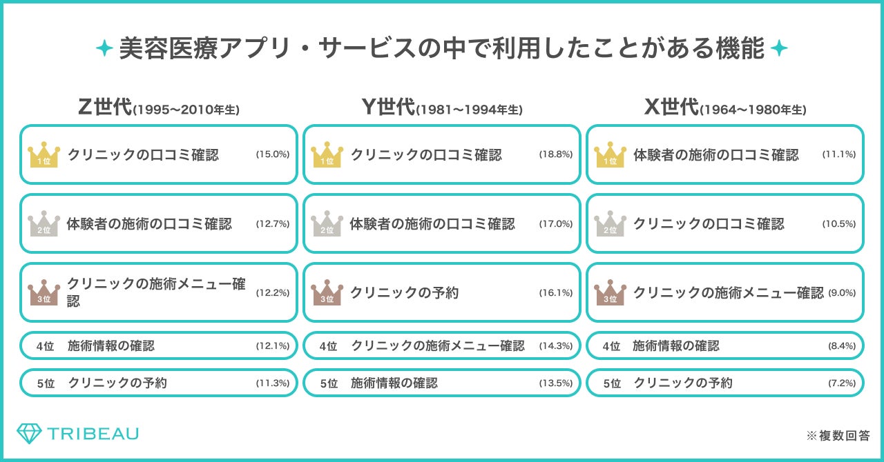 ・利用している美容医療のアプリ・サービスを聞いたところ、Z世代・Y世代には「トリビュー」が一番利用されている結果となっている。