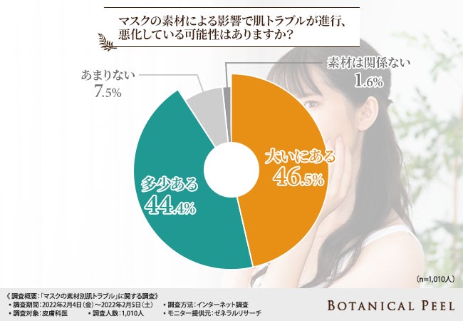 「マスクの素材による影響で肌トラブルが進行、悪化している可能性はありますか?」と質問したところ、『大いにある(46.5%)』『多少ある(44.4%)』という回答結果となり、9割の皮膚科医が、マスクの素材によって肌トラブルが引き起こされると考えているようです。