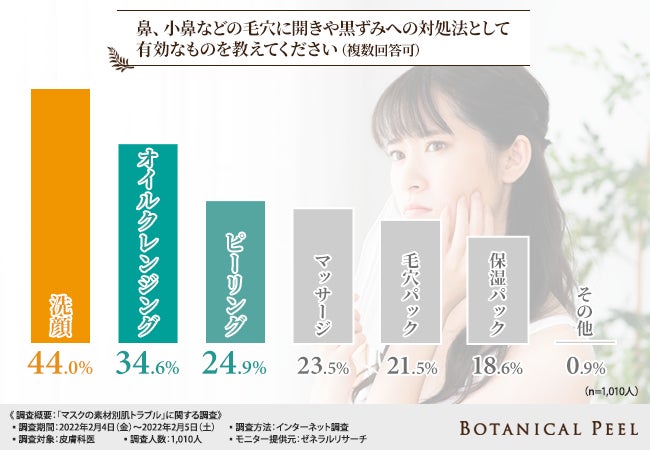 そこで、「鼻、小鼻などの毛穴に開きや黒ずみへの対処法として有効なものを教えてください(複数回答可)」と質問したところ、『洗顔(44.0%)』と回答した方が最も多く、次いで『オイルクレンジング(34.6%)』『ピーリング(24.9%)』と続きました。