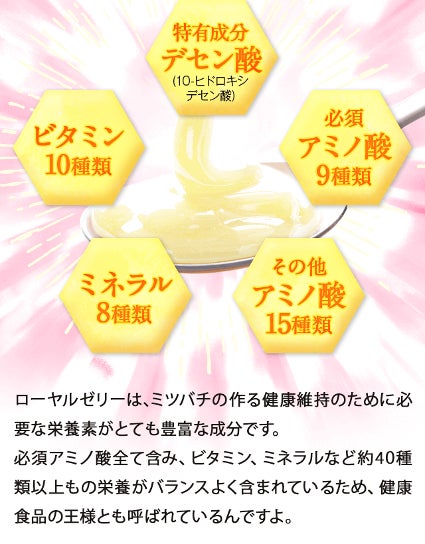 ローヤルゼリーは完全食と言われおり、ビタミン10種類、必須アミノ酸9種類、ミネラル8種類、そのほかアミノ酸15種類、特有成分としてデセン酸も含まれています。チベット高原に咲く無農薬菜の花から採取した高品質ローヤルゼリーだからこそ、高濃度のデセン酸が抽出されます。デセン酸は自然界においてローヤルゼリーにしか含まれていない脂肪酸の一種です。