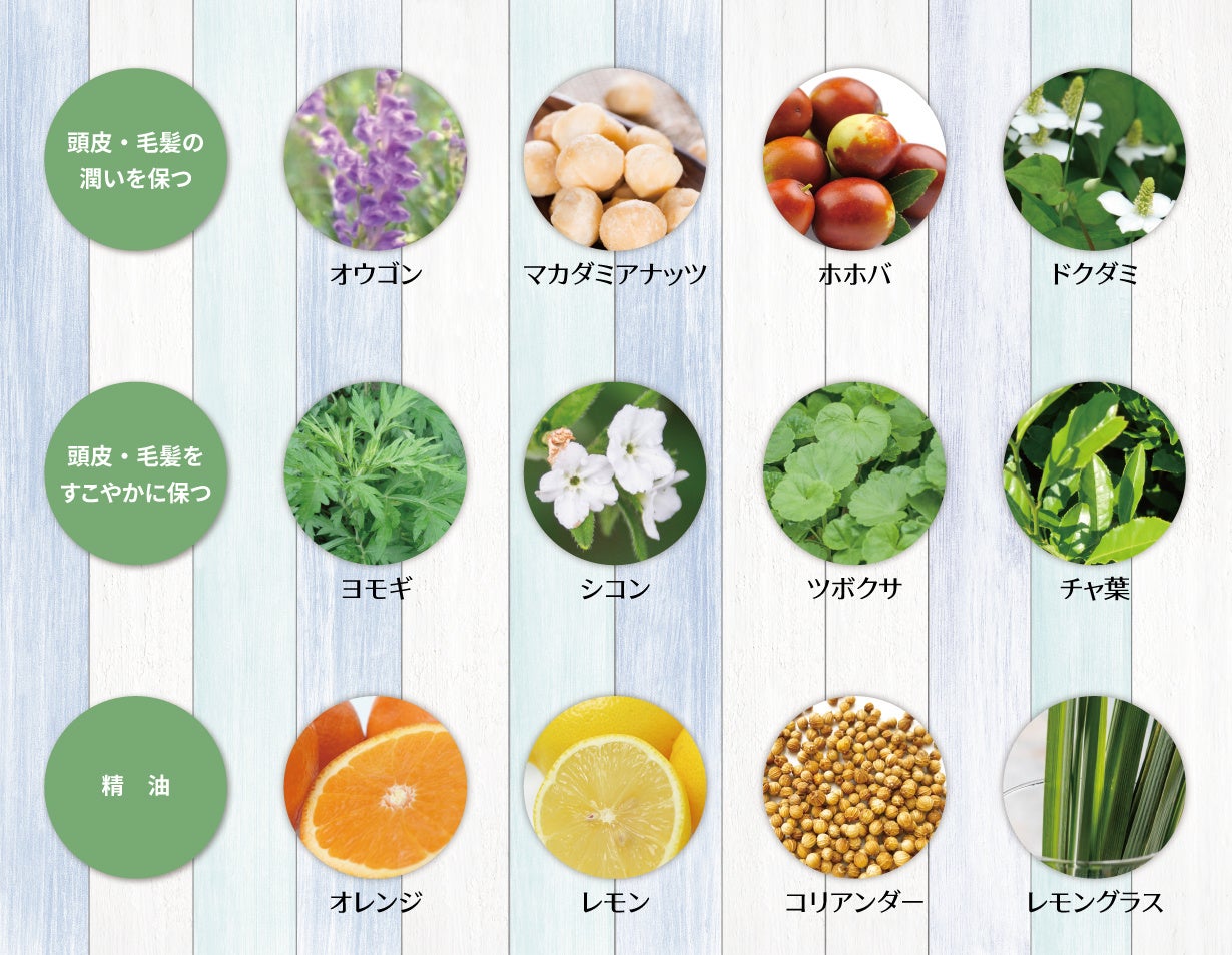 敏感肌に求められる高い保湿効果のために【ヒアルロン酸】【3種類のセラミド】【スクワラン】を配合。さらに【シコン】【ツボクサ】【ヨモギ】【ドクダミ】という和漢成分、【マカデミアナッツ・オイル】【ホホバ・オイル】という厳選した植物オイルを配合し、健やかな地肌と髪を導きます。