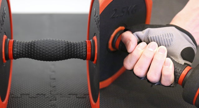 手のひらにフィットするダンベルシャフトのグリップ部分はTPR素材で出来ており、程よい弾力感とグリップ力があります。更に汗などで滑る危険を避けるため突起をつけ、よりグリップ力を強化しています。