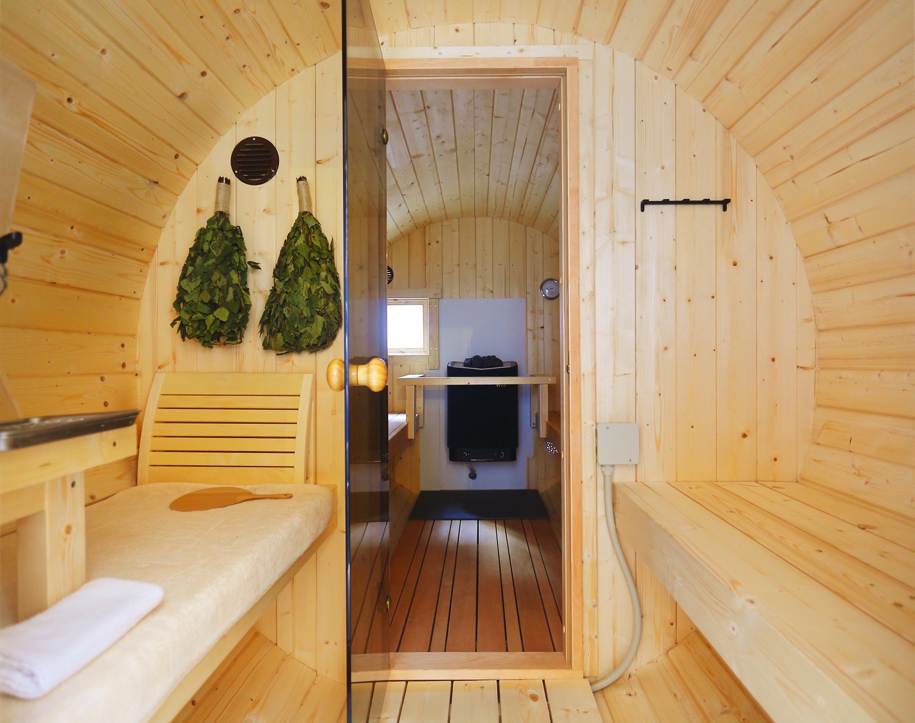 バレルサウナは樽型が特徴的な屋外用・屋内用のサウナです。円形の天井に沿って熱気が自然に降りてくるため、極上の蒸気を堪能いただくことが可能です。エストニアでは手軽に設置・堪能できるアウトドアサウナとして人気を博しており、近年日本でも宿泊施設や温浴施設における設置が増えています。
