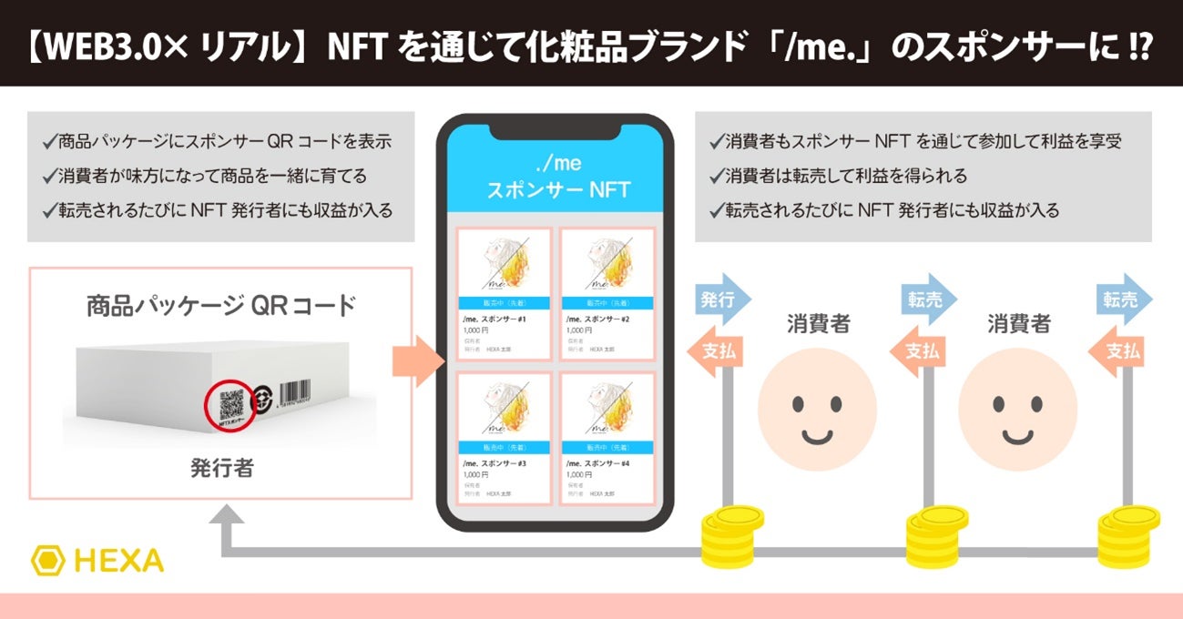 /me.の大きな取り組みの一つとして挙げられるのが、NFTマーケットのHEXA(ヘキサ)が提供する新サービス「スポンサーNFT」の発行です。