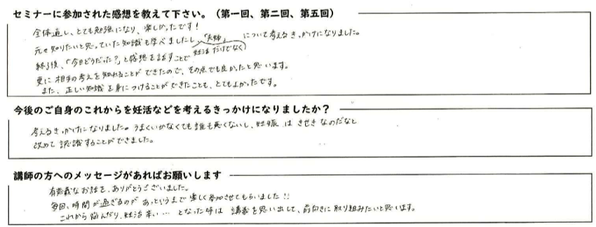 『全体を通し、とても勉強になり楽しかったです!元々知りたいと思っていた知識も学べましたし、妊活だけでなく「夫婦」について考えるきっかけにもなりました。終了後、「今日どうだった?」と話すことで更に相手の考えを知れることができたので、その点でもよかったと思います。また、正しい知識を身に付けることができたこともとてもよかったです。』