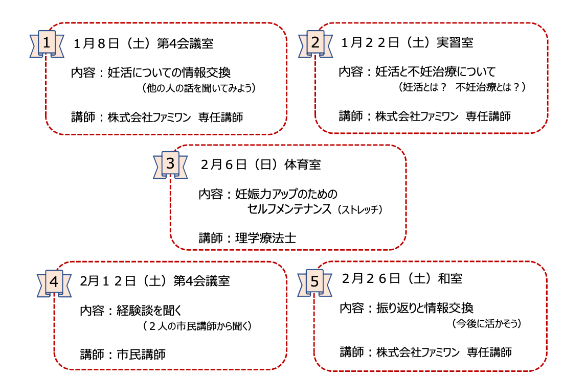 2022年1月8日に第一回となる「妊活についての情報交換(他の人の話を聞いてみよう)」を開催。1月22日には第二回「妊活・不妊治療について」を、そして2月26日には全5回の最終回となる「振り返りと情報交換(今後に活かそう)」を開催しました。