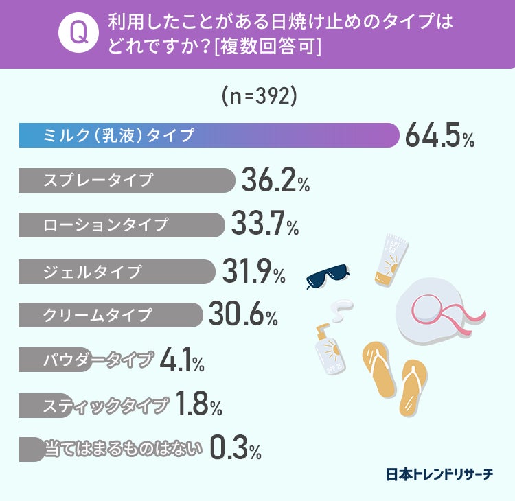日焼け止めを「外出しない日も毎日必ず使う」「外出時は必ず使う」「季節・時期によって使う」と回答した方(392名)に、「利用したことがある日焼け止めのタイプ」を聞いてみました。