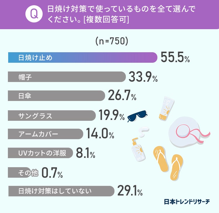 複数回答で答えてもらったところ、55.5%の方が「日焼け止め」を使っているようです。