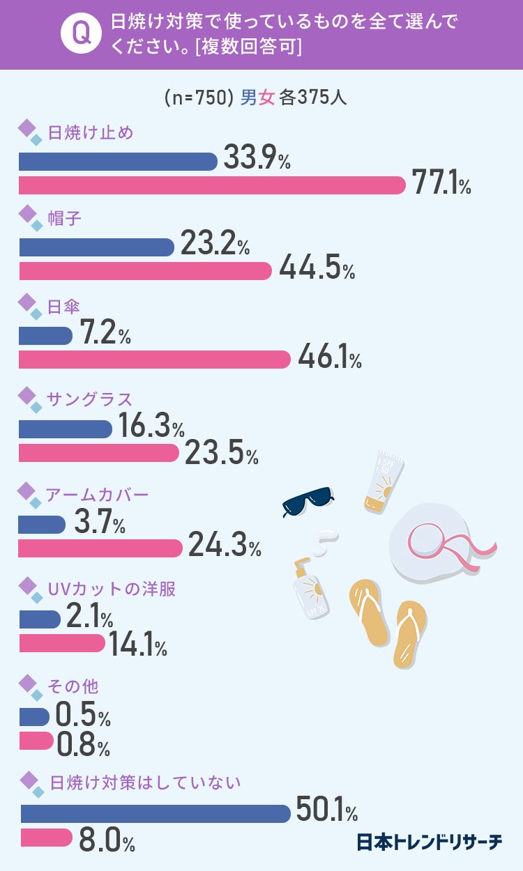 一方で、男性の50.1%は「日焼け対策はしていない」ようです。