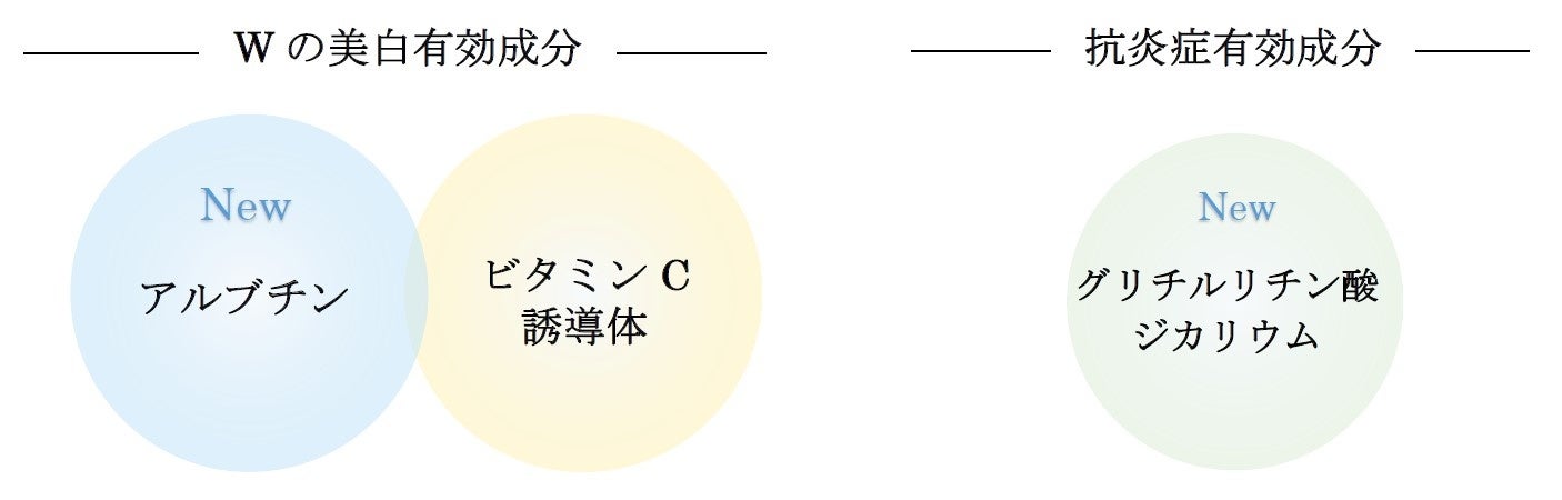 美白有効成分「ビタミンC誘導体*1」に加え、「アルブチン」を新配合。シミができるメカニズムにアプローチします。さらに、抗炎症有効成分「グリチルリチン酸ジカリウム」も新配合し、透明感のあるすこやかな肌に整えます。