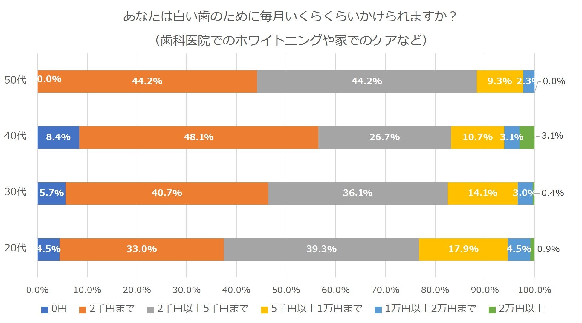 歯科医院で受けるホワイトニングやホームケアなど、白い歯のために毎月いくらくらいかけられますか?という質問では各年代で「2000円まで」と「2000円以上5000円まで」に多くの回答が集まりました。