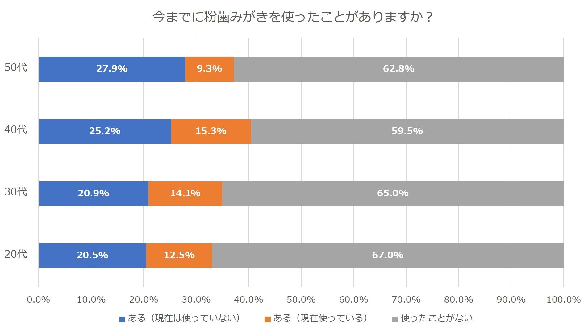 白い歯のためにホワイトニング歯みがき粉を使用している女性は多いのですが、粉(パウダー)タイプの歯みがき粉の使用経験があるのは36%にとどまりました。
