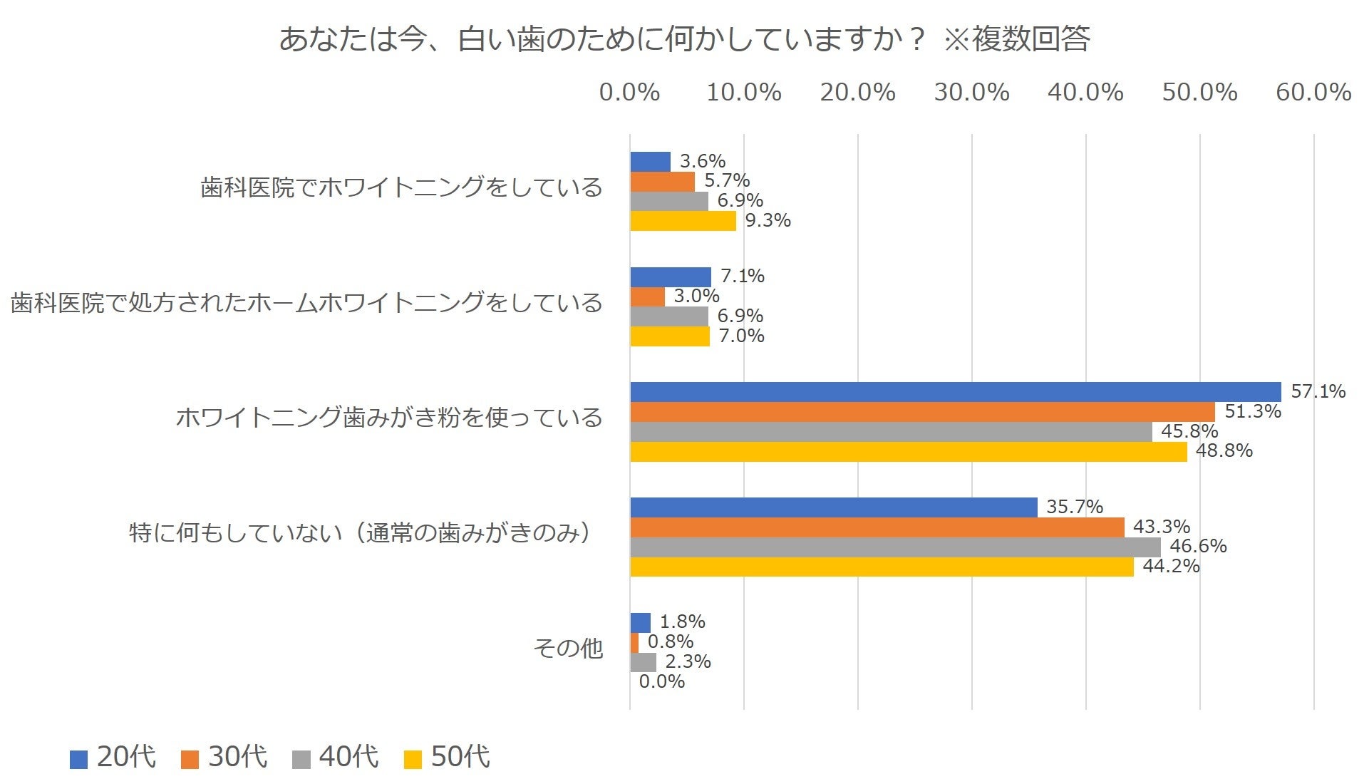 また各年代で「ホワイトニング歯磨き粉」を使用しているという回答が最も多く、毎日の歯みがきで白い歯を保ちたいという意識がうかがえます。