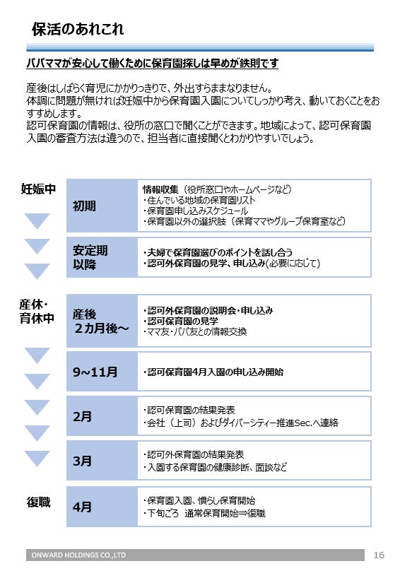 ・2014年 配偶者の出産日や退院日、子供の1歳の誕生日に休暇を推奨する育児奨励休暇を設け、対象者への育児休業および育児奨励休暇取得の通知や、産休取得前の面談(プレママ研修)および復職前の面談を実施