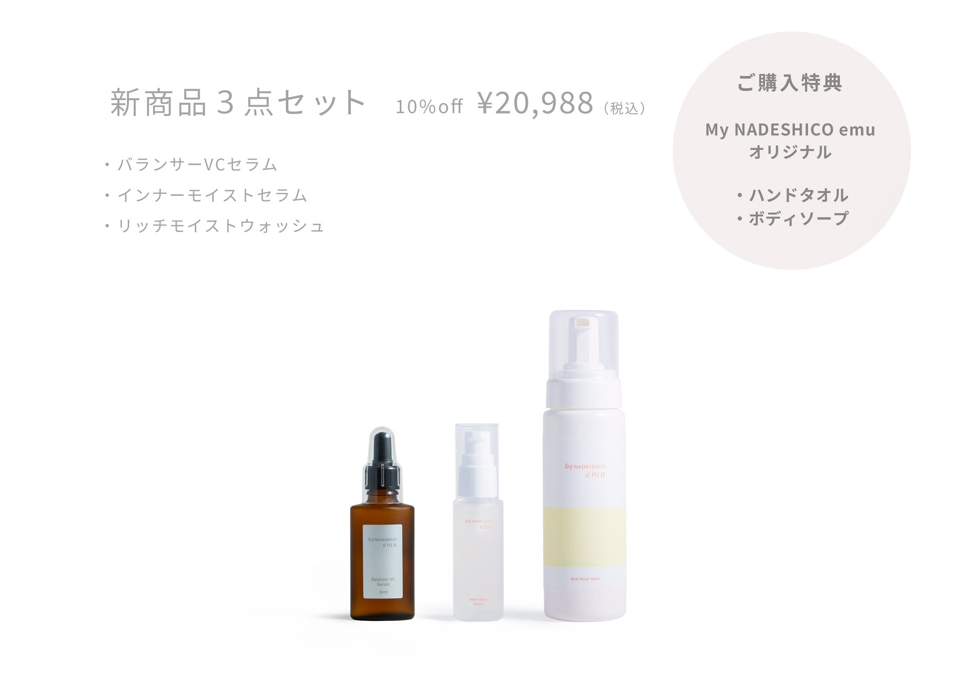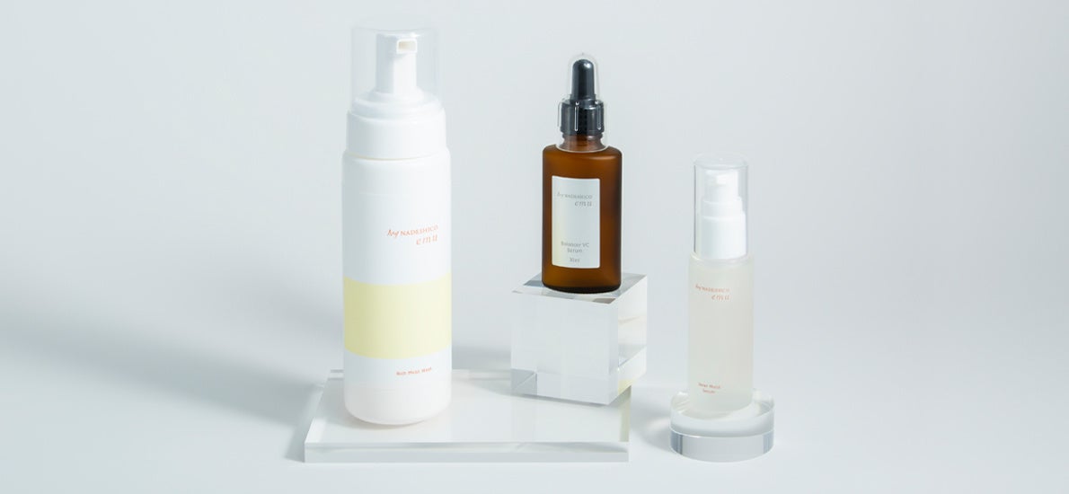 更なる美しさへのステップアップとして、エイジングや繰り返す肌荒れにフォーカスした高機能系スキンケアラインの『My NADESHICO emu』シリーズ から《全ての肌悩みにアプローチできる》をコンセプトに、新たに3つの商品が発売されます。
