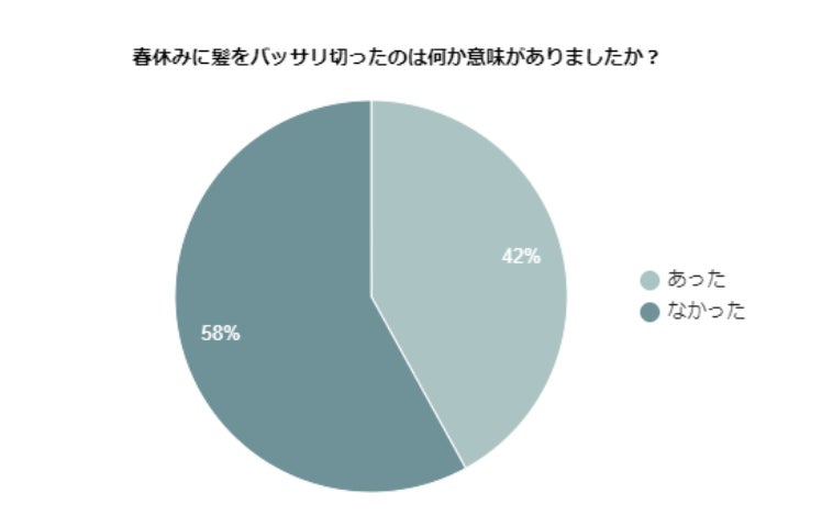 春休みに髪をバッサリ切ったのは何か意味があったと答えた人は42%と半数まではいかない結果です。とくに「春休み」ということは意識していなかったということだと思われます。