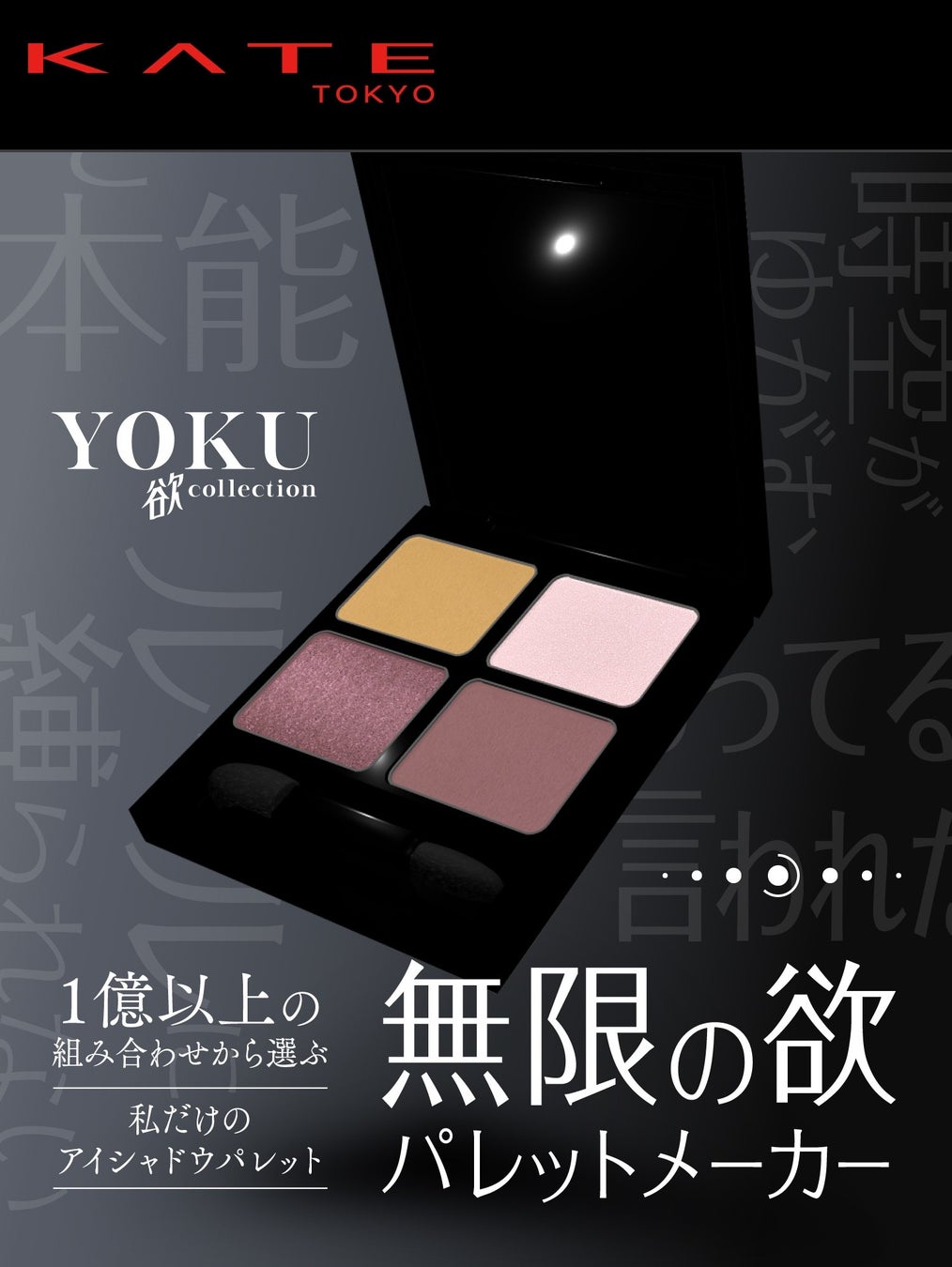 もっと自由に、自分らしさを解放する「エネルギッシュな欲」と「アンニュイな欲」の2つの”欲”を叶える4色セットアイシャドウ『ケイト ザ アイカラーズセレクト(YOKU)』をはじめ、アイライナー&アイシャドウとして使える6色入りペンシルセット、ジェルグリッター、2色セットのハイライト、そして無限に生まれる“欲”を満たす単色アイシャドウをラインナップ。