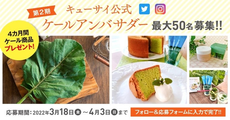 キューサイ株式会社(本社:福岡市中央区、代表取締役社長:神戸 聡)は、本年9月にケール事業40周年を迎える記念として、一層多くの方にケールのチカラをお届けするため当社とともにケールの魅力を発信していただく第2期「キューサイ公式ケールアンバサダー」を最大50名募集いたします。第1期は、募集人数40名に対し、1,000名以上の方のご応募があり、大変好評をいただきました。今回は、5~8月に活動していただく第2期の募集となります。アンバサダーに就任された方には、健康や美容によい栄養素が豊富な生命力あふれるケールのある暮らしをご体験いただけるよう、4カ月間にわたり当社おすすめのケール商品を毎月プレゼントいたします。