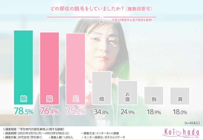 「どの部位の脱毛をしていましたか?(複数回答可)」と質問したところ、『腕(78.5%)』と回答した方が最も多く、次いで『脇(76.4%)』『足(75.2%)』と続きました。