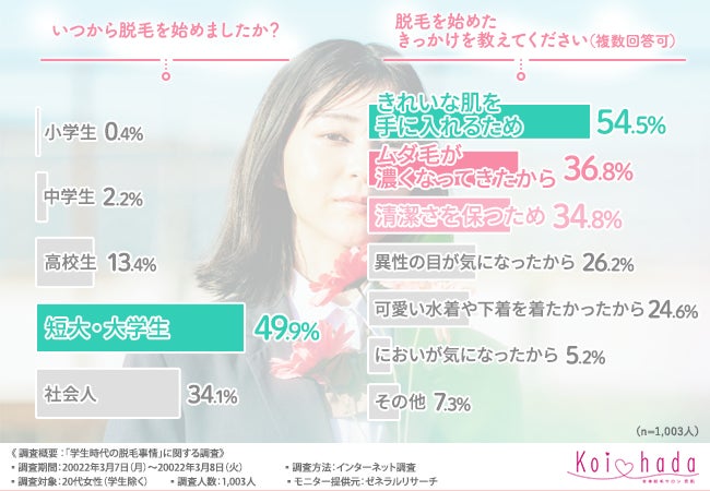 今回の調査で、きれいな肌を手に入れることを目的として短大・大学生時代に脱毛を始めた方が多いことがわかりました。
